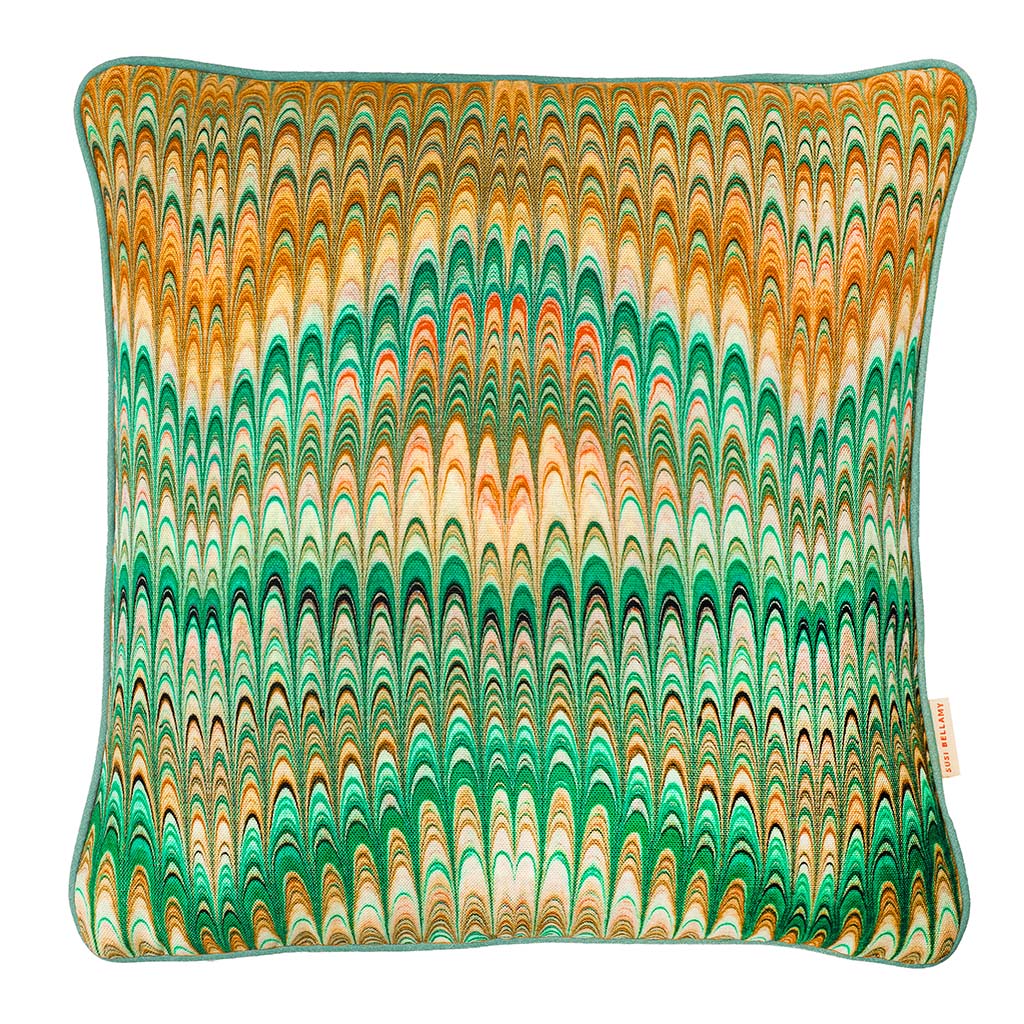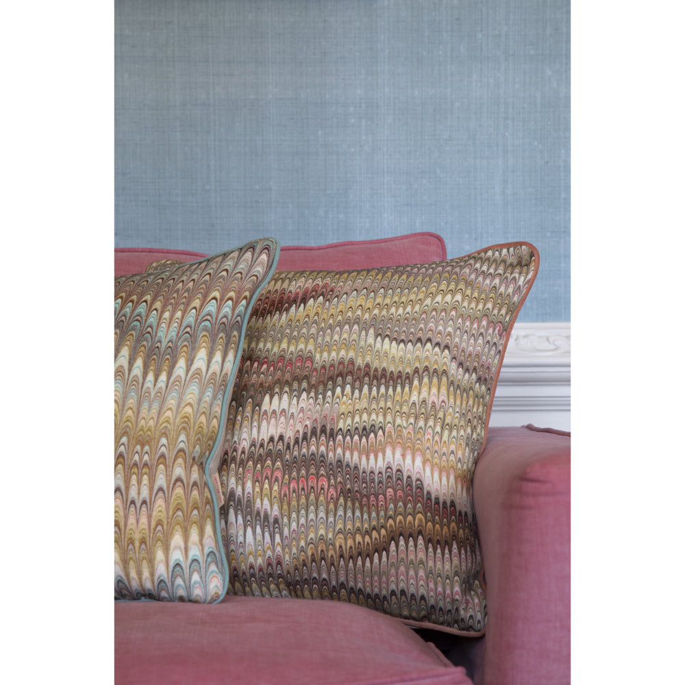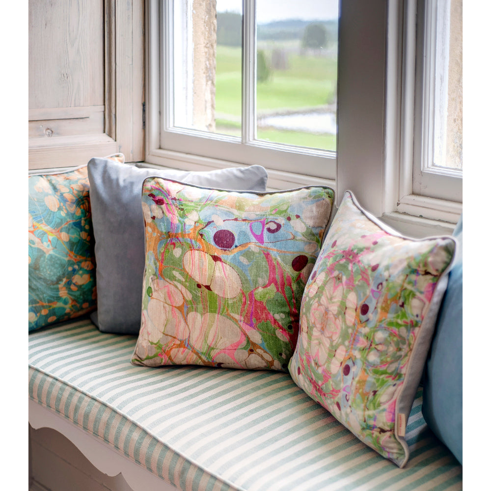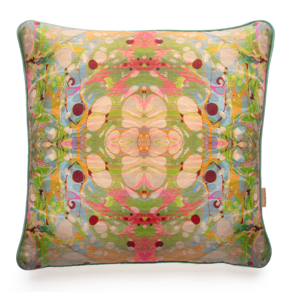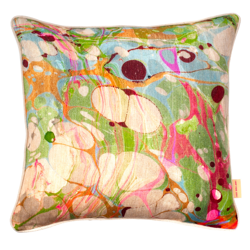 The linen collection of cotton-backed cushions marry unexpected combinations of neutral and acidic colours with a woven, organic feel to create a more down-to-earth collection for the home. The plasmic effect created in the marbling process recalls natural textures that float across the surface of the cushion in candied colours.