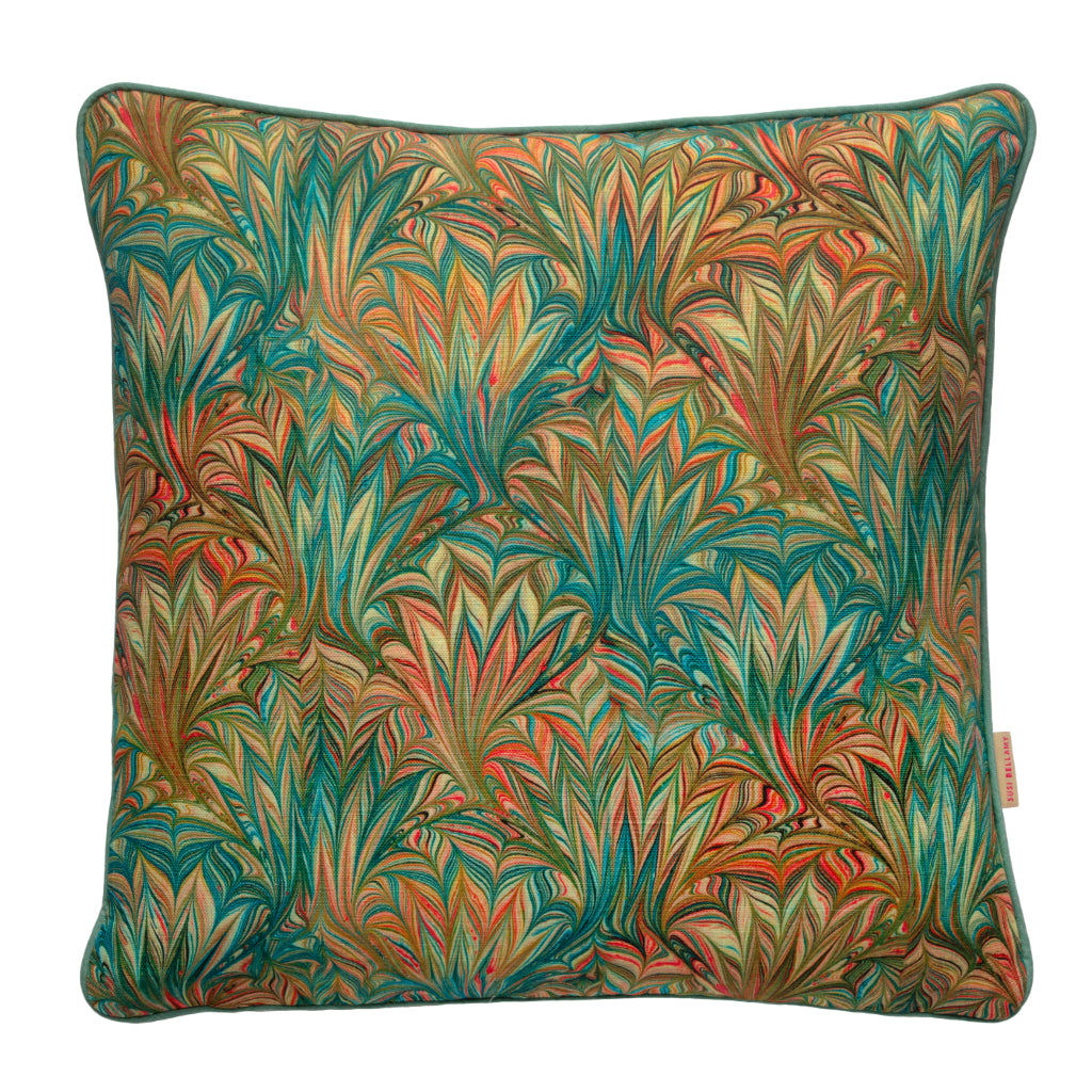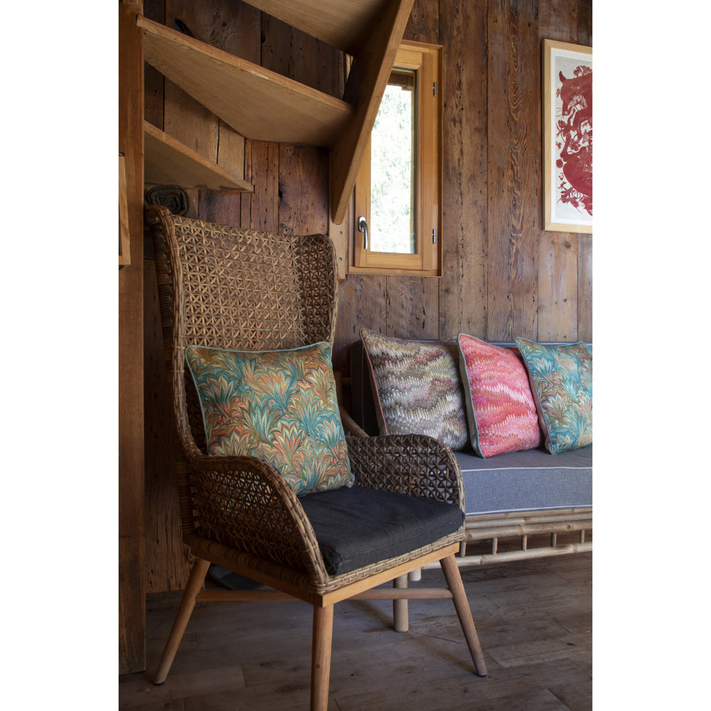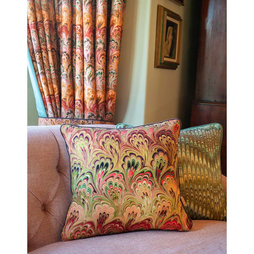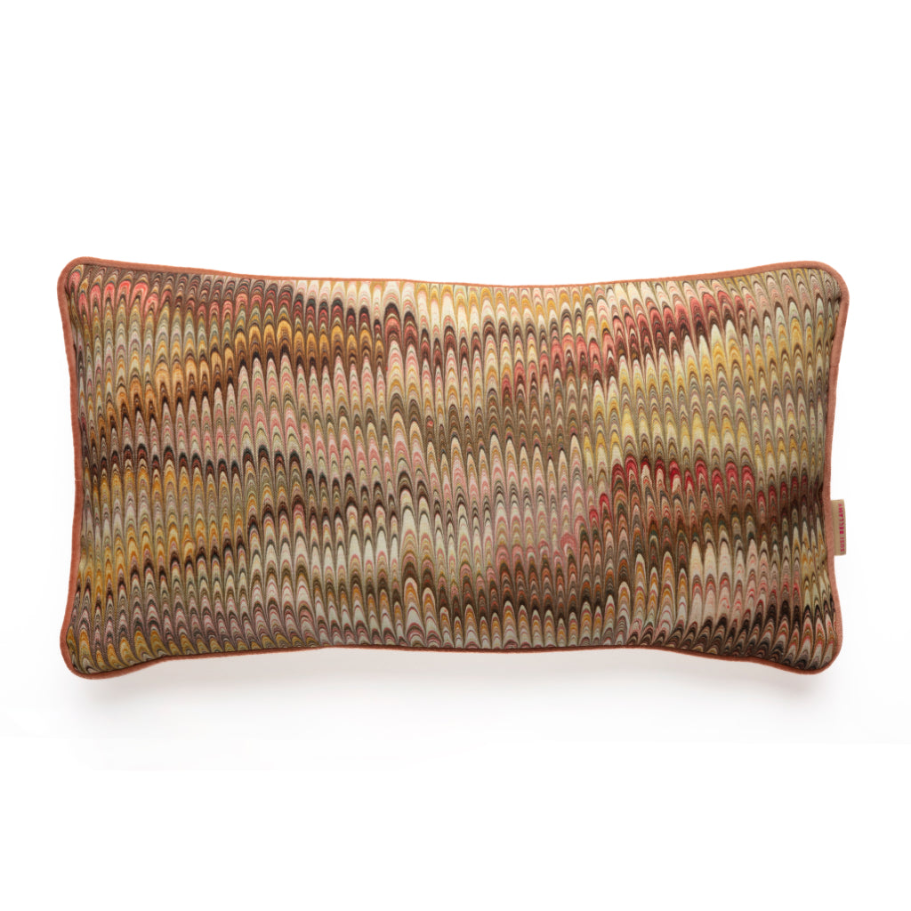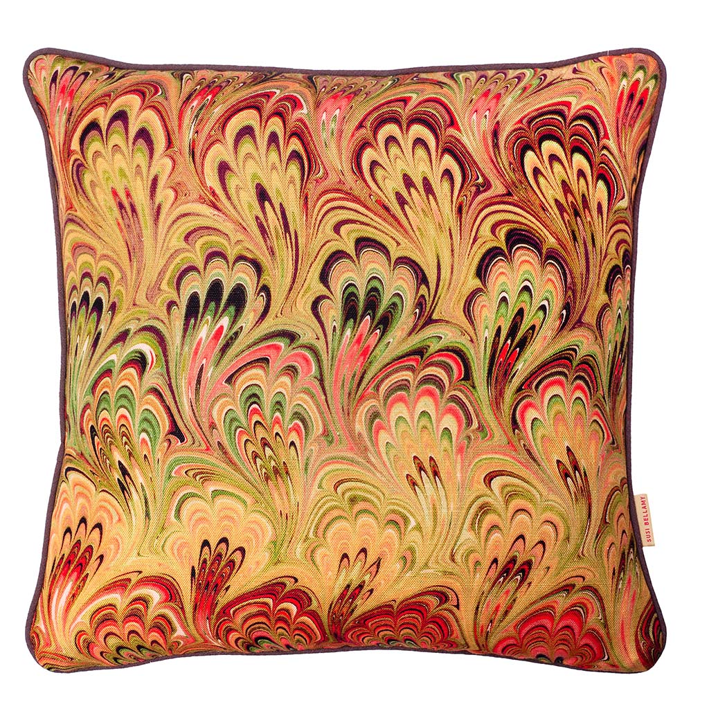 The linen collection of cotton-backed cushions marry unexpected combinations of neutral and acidic colours with a woven, organic feel to create a more down-to-earth collection for the home. The plasmic effect created in the marbling process recalls natural textures that float across the surface of the cushion in candied colours.