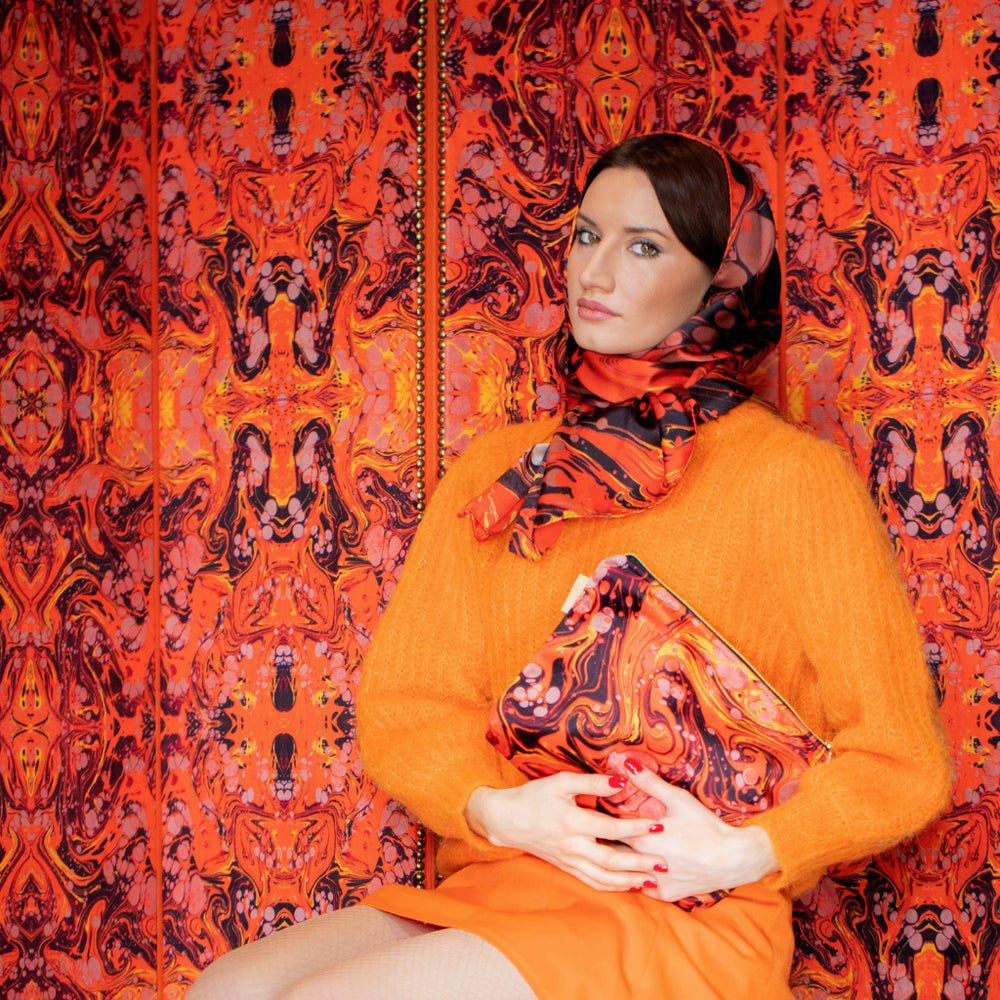 This fabulous new addition to our sumptuous velvet pouch collection is the deep Orange Carnelian Marbled design.  Wear as an evening bag or simply use in your handbag to carry your phone charger and perfume!