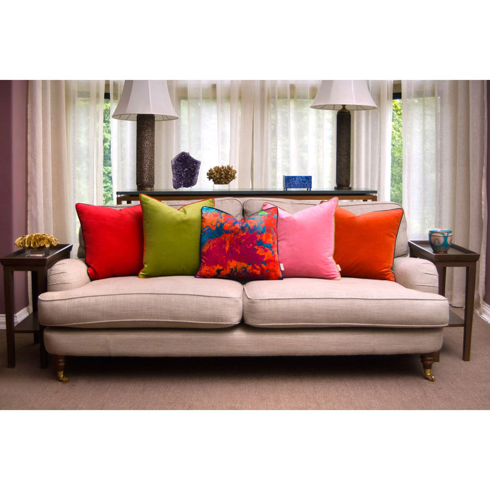 Modern style meets classic romance with our hot pink plain velvet cushion. A bubblegum tone with contrasting green piping makes an extremely playful and fun colour palette. Perfect for bedrooms and living rooms alike. Mix and match with our linen collection for an eclectic combination of textures.